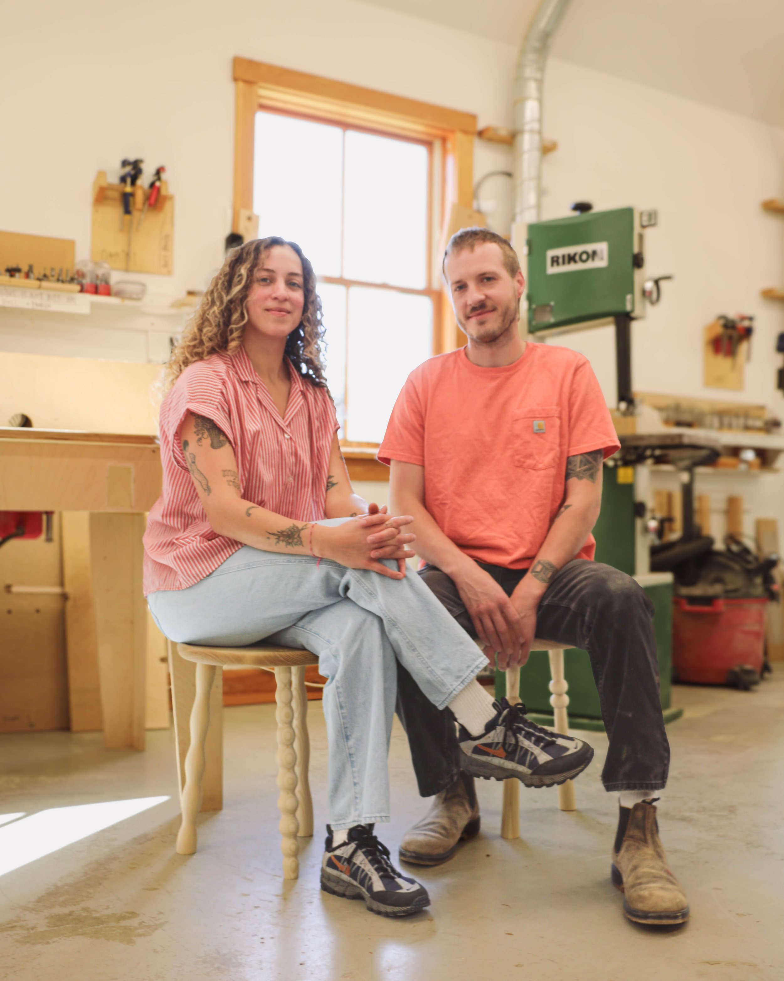 superblue: not just a house was produced during a joint residency at the Center for Furniture Craftsmanship in Rockport, Maine in 2024. Over the course of eight weeks, Jamie and Michelle designed and built coffee tables, benches, side tables, stools, and a dining table. Each form was produced in two ways: one rooted in the dreamed-up idea of their shared domestic space, with the other responding to familiar and traditional design language. Throughout 2025, they made additional pieces exploring basketweaving, rug tufting, and lamp-making to create a body of work that feels like home.